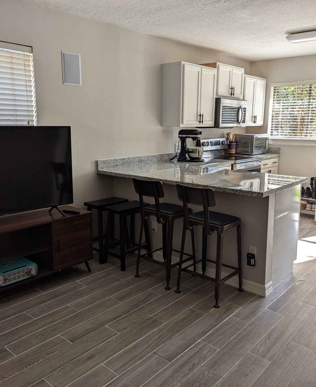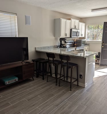 A fully functional kitchen, bathroom, sleeping area and breakfast bar. Freshly painted walls, ceilings, trim, tile floors, granite countertops, with key-less entry. Full bathroom and shower with granite counter top and tile floors