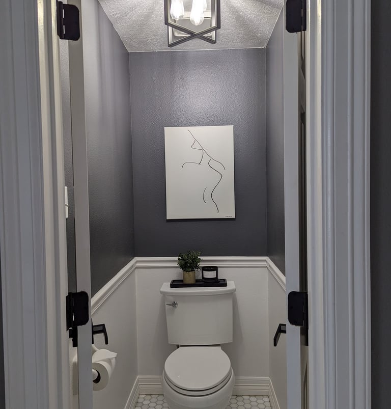 Half bathroom with freshly painted walls, ceilings, wainscot, chair rail. New marble countertop, faucet, tile flooring and light fixture.